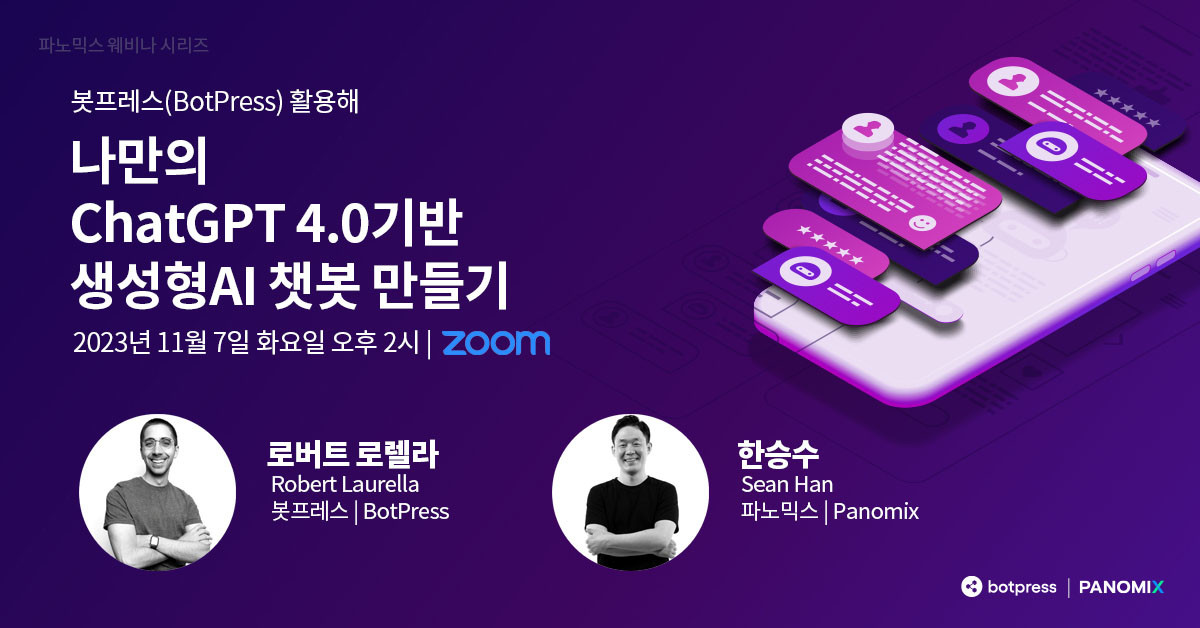 마케팅 테크 기업 파노믹스가 개발 경험 없이도 Botpress 플랫폼으로 ChatGPT 기반 AI 챗봇을 만드는 무료 웨비나를 개최했습니다.